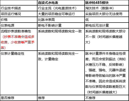 三.光电直读式水电表与纯脉冲+脉冲转485模块电表优缺点对比