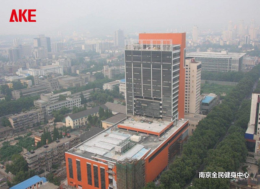 南京全民健身中心是中国第一座高层体育健身中心,也是中国单体建筑面积最大的健身中心。建筑高度达100米,其中主楼地上19层,地下2层,占地13500平方米,总建筑面积有7万平方米。